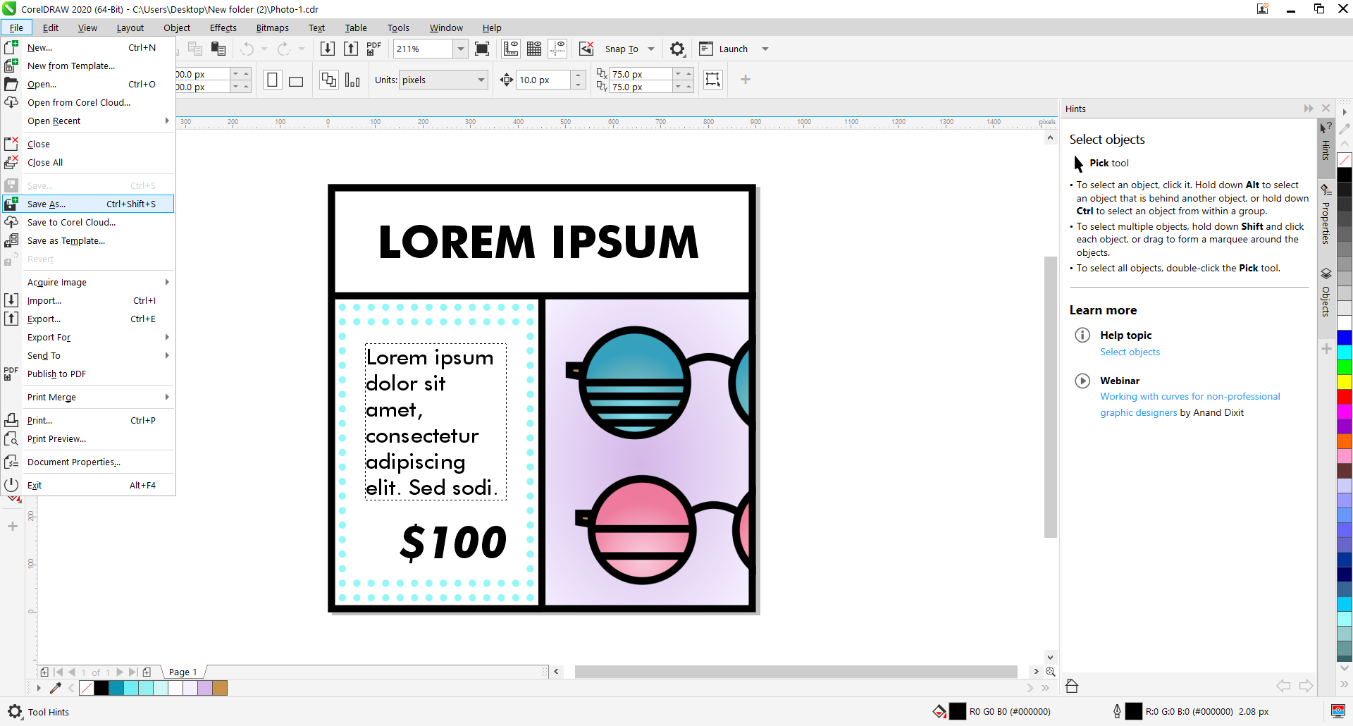 First, open your CDR file in CorelDRAW. Choose one option in the File menu (Export, Publish to PDF, Save as).