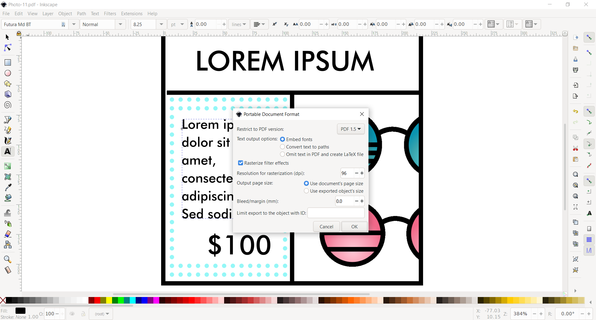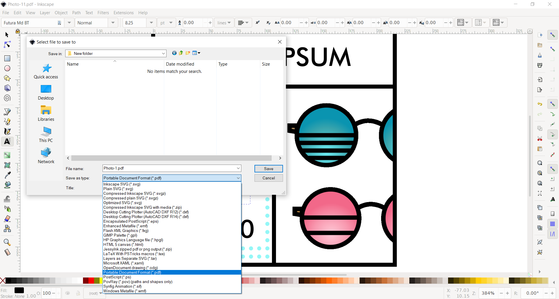 Open CDR file in Inkscape. Fix elements that didn’t import well in our example text. In the File menu, choose Save As option.